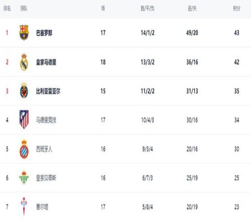 在积分榜上,巴萨依然占据榜首位置,14胜1平2负,拿到43分。皇马赢球之后,战绩变成13胜3平2负,总积分达到42分,排名第2,只落后1分。不过,皇马比巴萨多踢了1场。比利亚雷亚尔以35分排名第3。第4的是马竞,拿到了34分。西班牙人以30分排名第5。第6名的是皇家贝蒂斯,拿到25分。